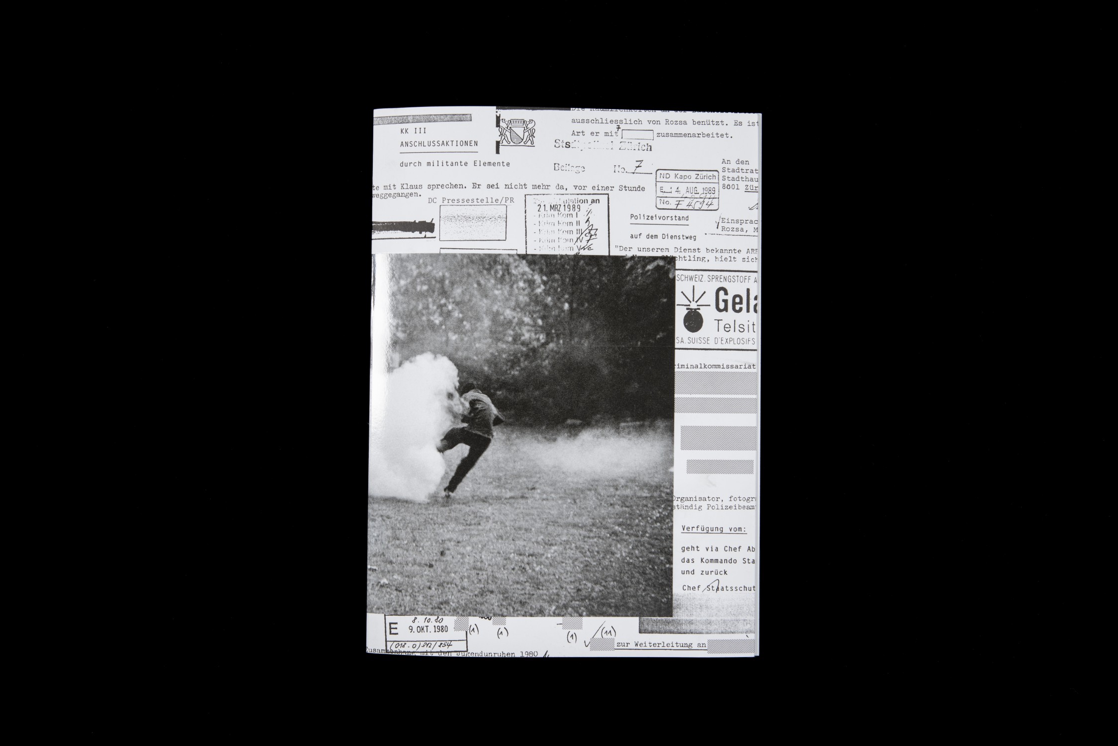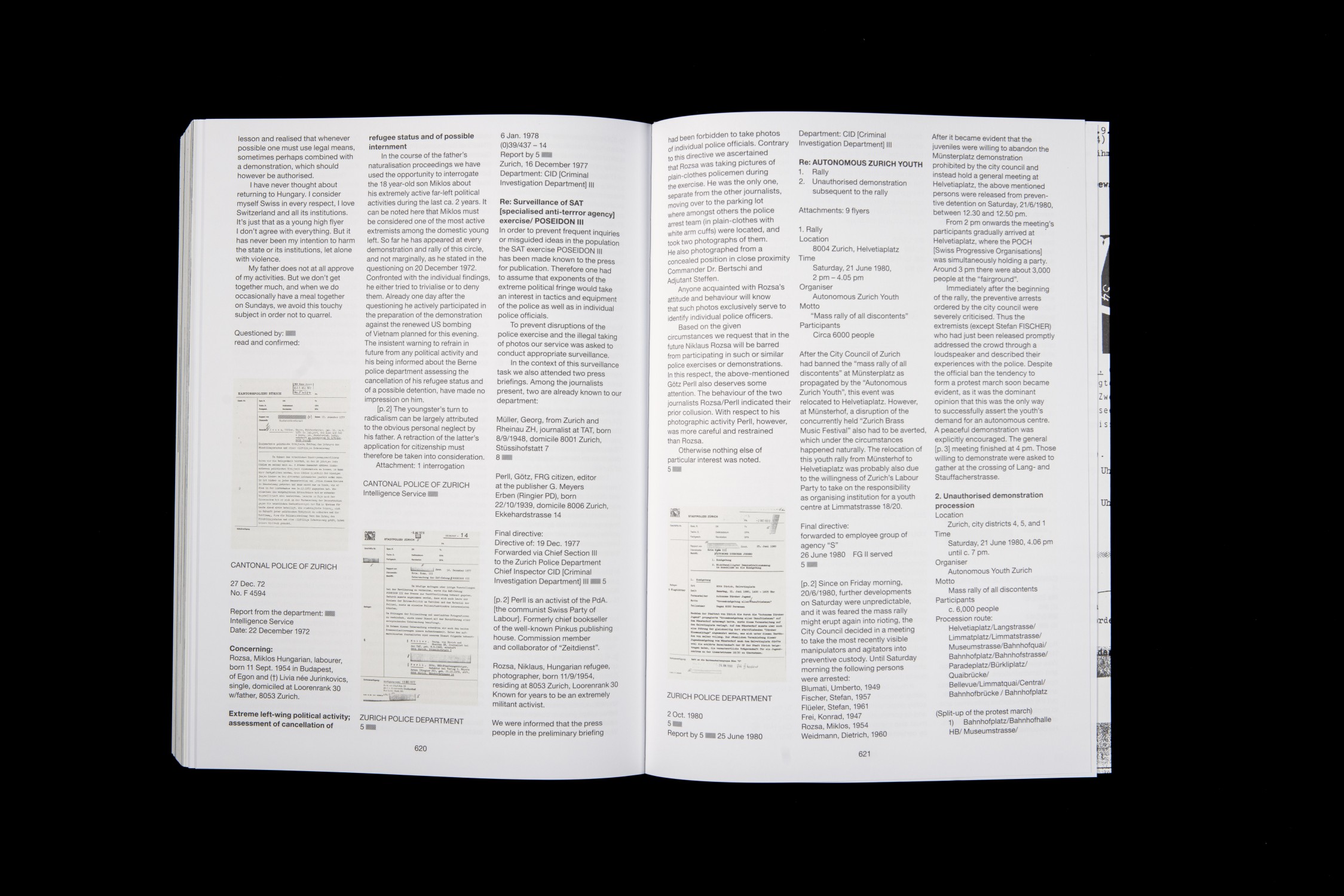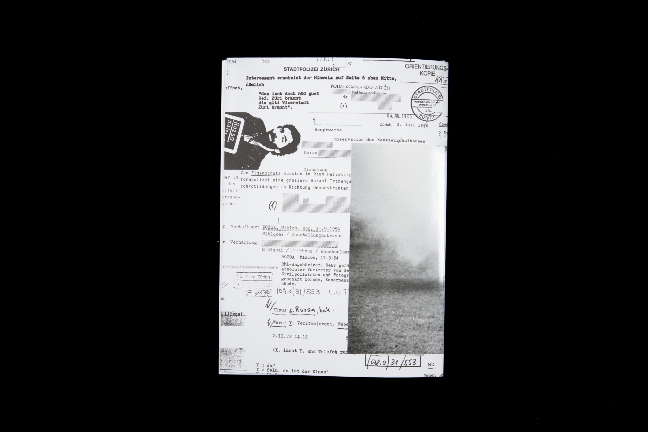 Miklós Klaus Rózsa draws on the documents compiled by the photographer and political activist Miklós Klaus Rózsa (1954) from 1971 to 1989, consisting of an assortment of photographs taken by Rózsa as well as state security files on Rózsa, as reported by the Federal Police, the Cantonal Police, and the Zurich Police Department. The published materials all stem from Rózsa’s personal archive. The use of pictures and state security files from other sources has been intentionally excluded as the authors intent is to make the scope of the whole movement and counter movement tangible through one exemplary individual. This single-sourced form was only to be made possible through the comprehensive archive of Klaus Rózsa. The duality is fascinating, the fact that both sides subjectively report about the same event, but in quite different ways.