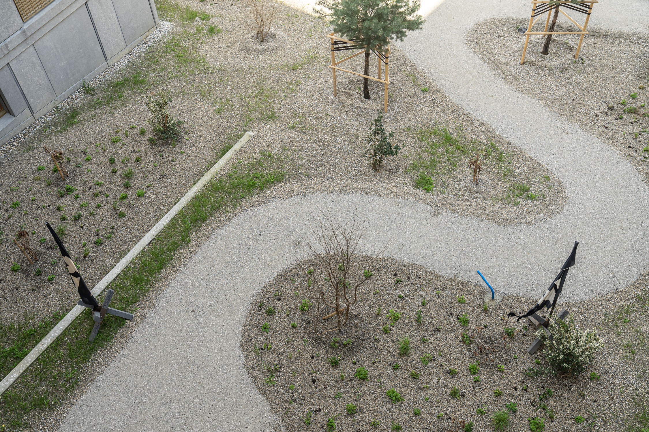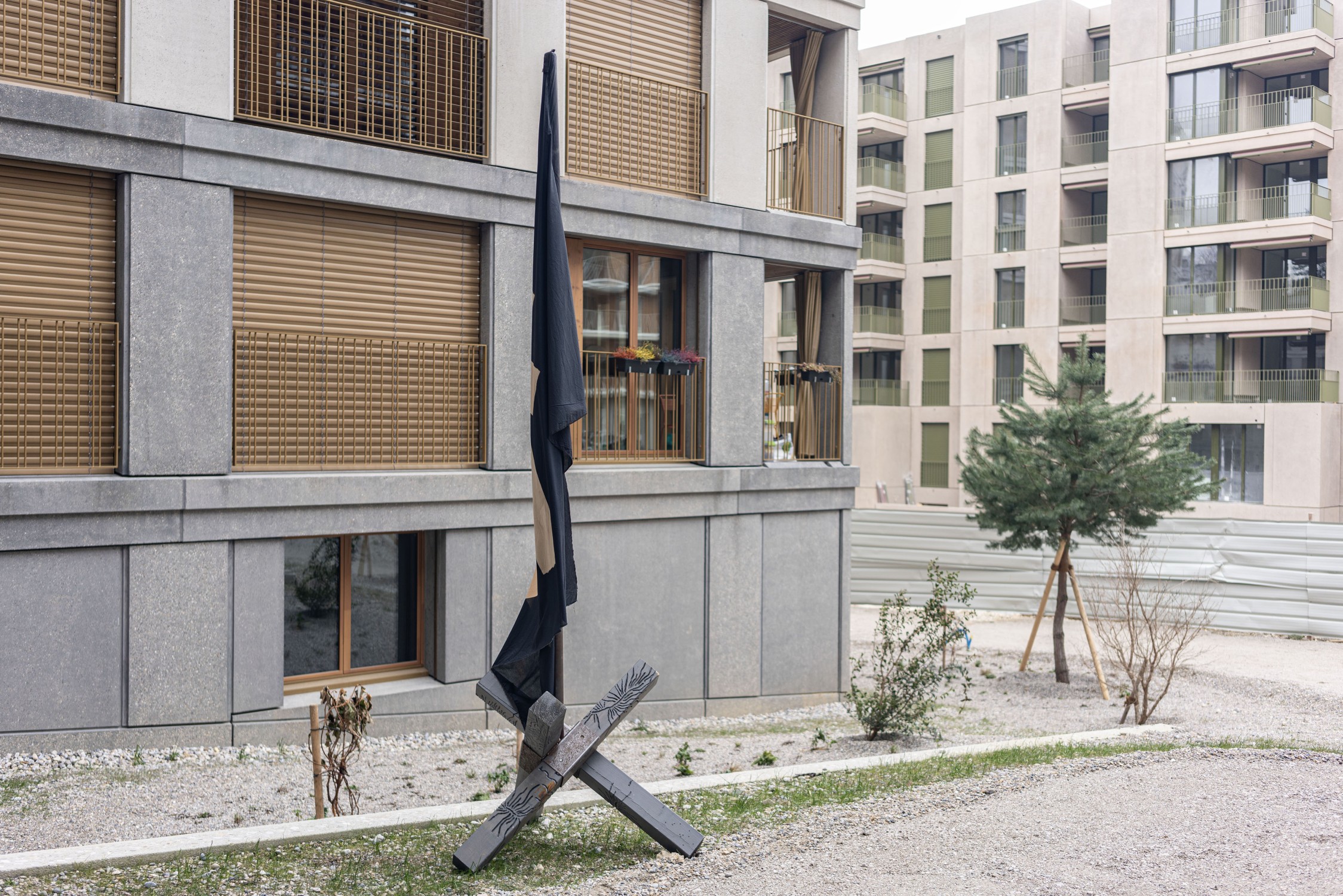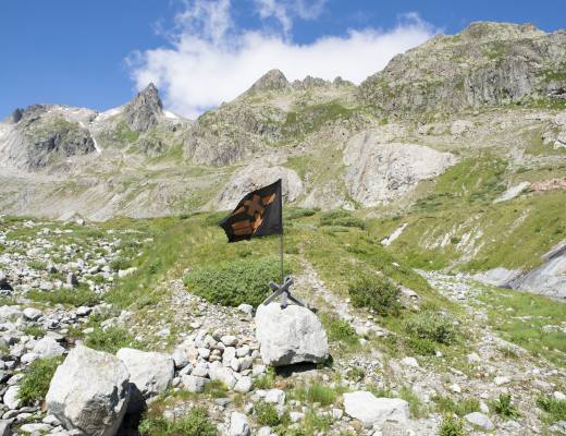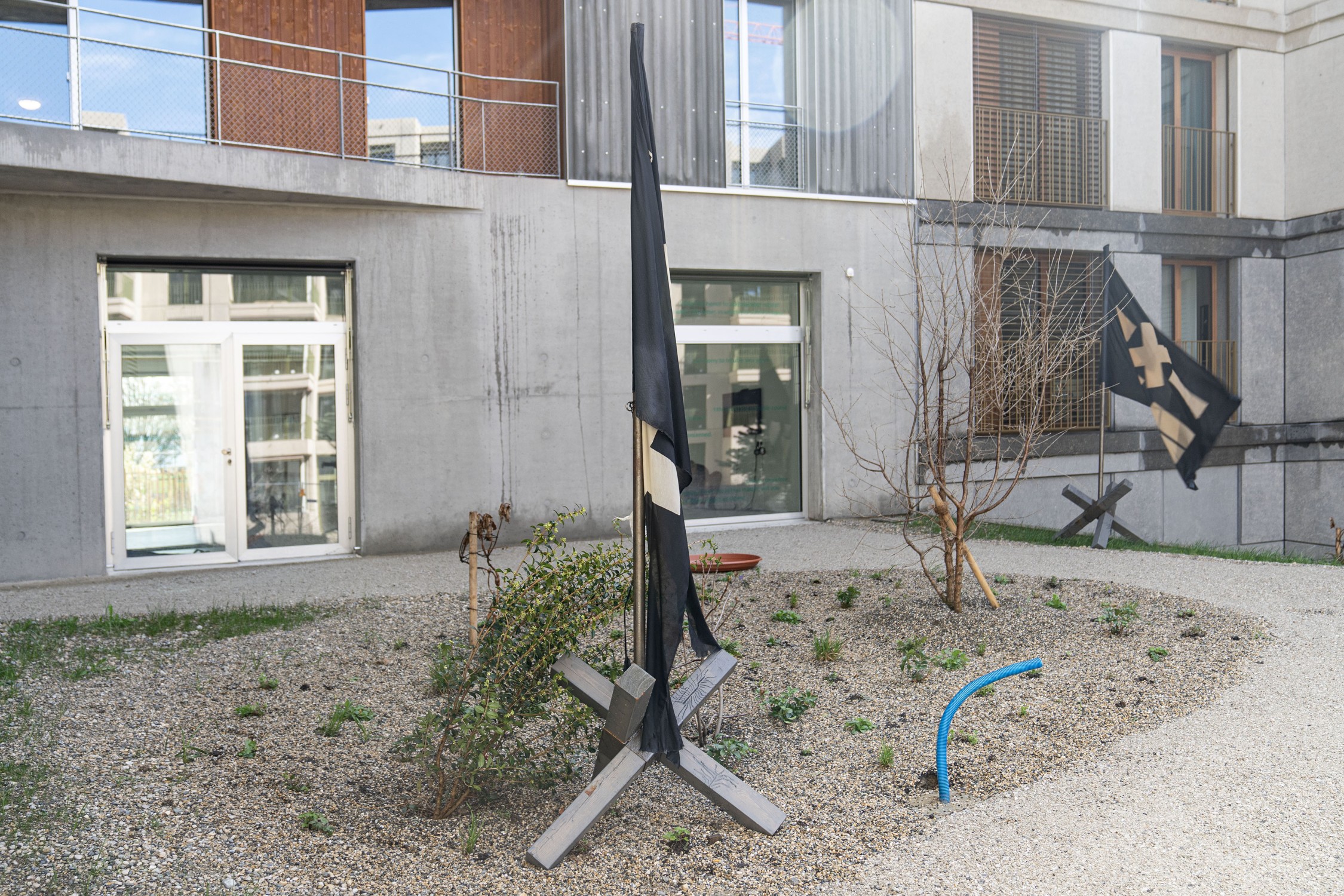 –×–=+ [Lausanne] 2 flags; –×–=+ [Furka] and –×–=+ [Steingletscher] Fabric, wood, paint, metal, 50x50x250cm, 2022–2023 with Claudia Barth 3.3.–22.4.2023; At Your Earliest Convenience, CALM; Lausanne (CH) See also